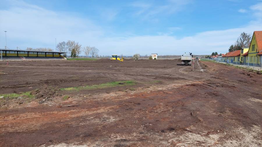 Seit Anfang März rollen schwere Baufahrzeuge, dort wo sich vorher Laufbahn und Fußballplatz befunden haben. Viel Erde wurde bereits durch die ausführende Baufirma Artifex Barthel abgetragen und somit Baufreiheit geschaffen.